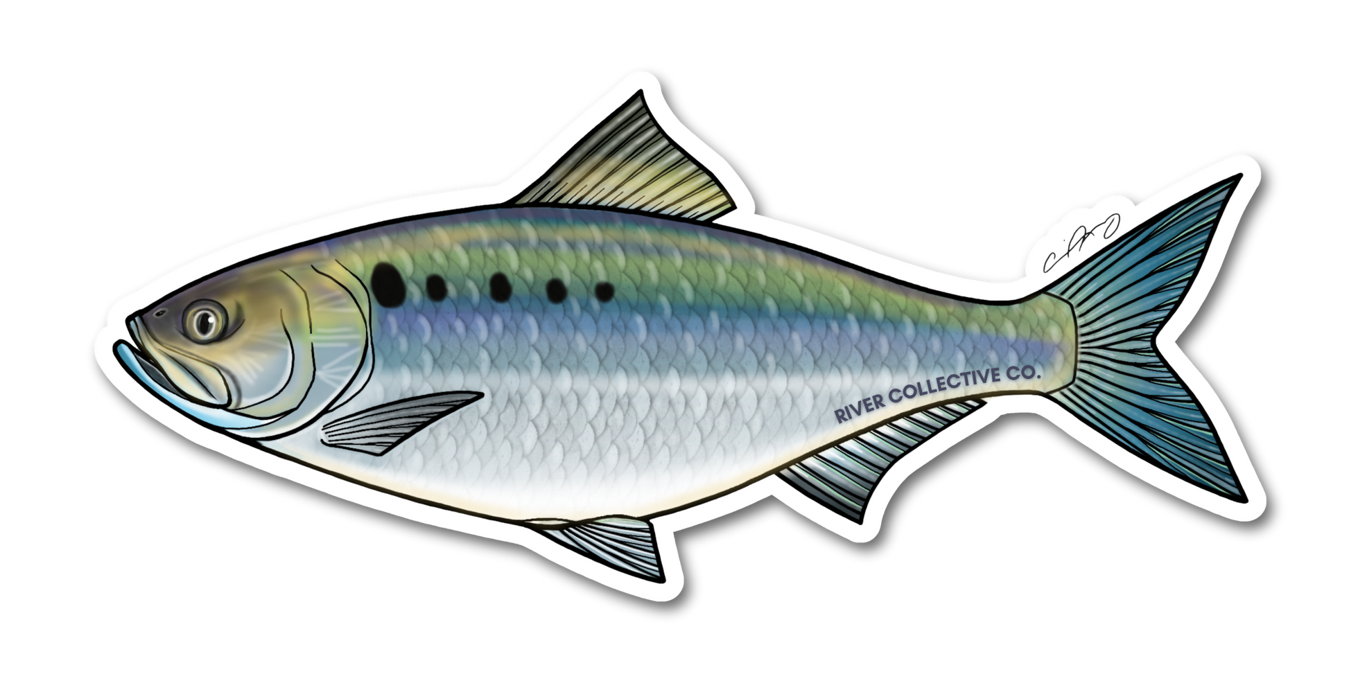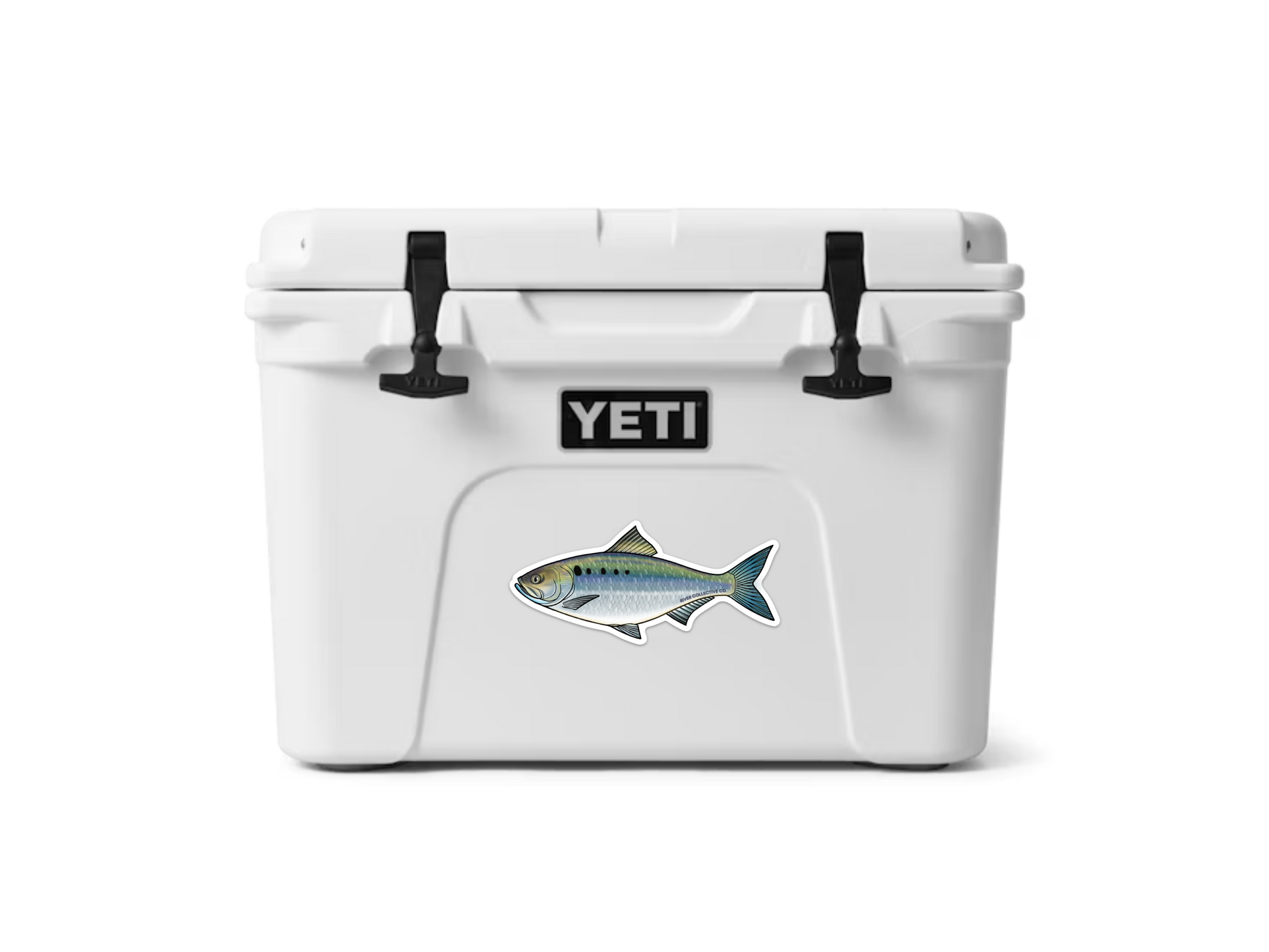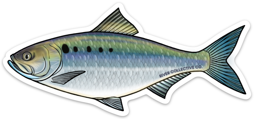 Durable outdoor vinyl waterproof American Shad. Hand drawn original artwork! Perfect for your vehicle, boat, trailer, tackle boxes, coolers, water bottles, coffee mug, etc... Dimensions: 6" x 2.75".