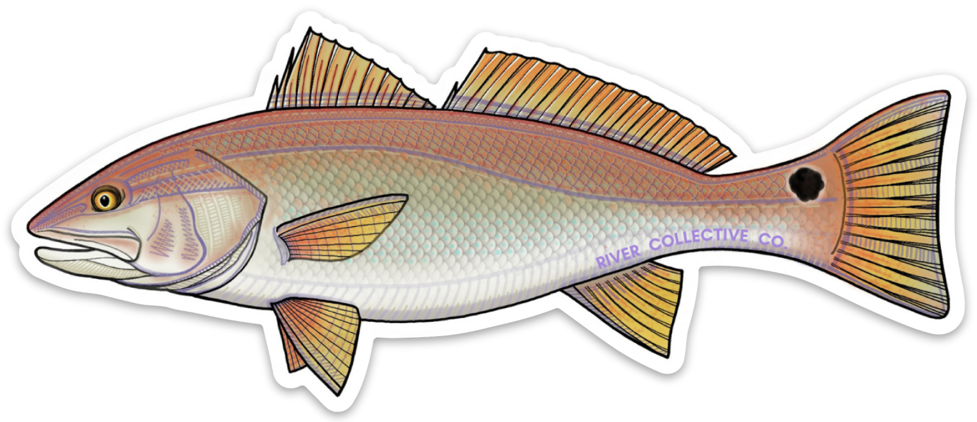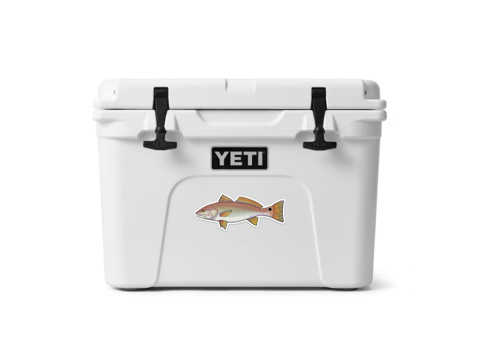 Durable outdoor vinyl waterproof Redfish Decal. Hand drawn original artwork! Perfect for your vehicle, boat, trailer, tackle boxes, coolers, water bottles, coffee mug, etc... Dimensions: 6" x 2.31".