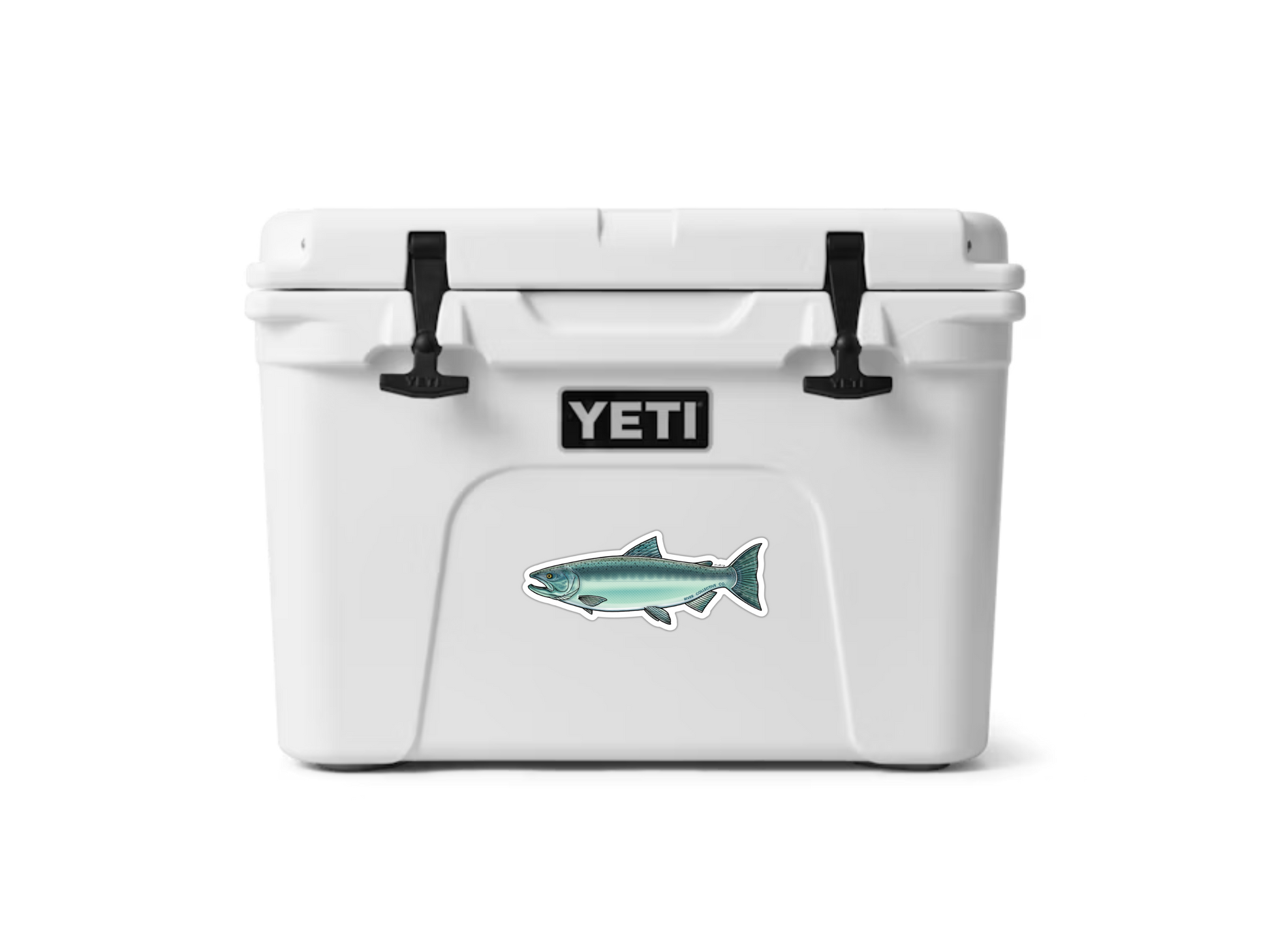 Durable outdoor vinyl waterproof Chinook Salmon decal (Saltwater). Hand drawn original artwork! Perfect for your vehicle, boat, trailer, tackle boxes, coolers, water bottles, coffee mug, etc... Dimensions: 6" x 2.4".