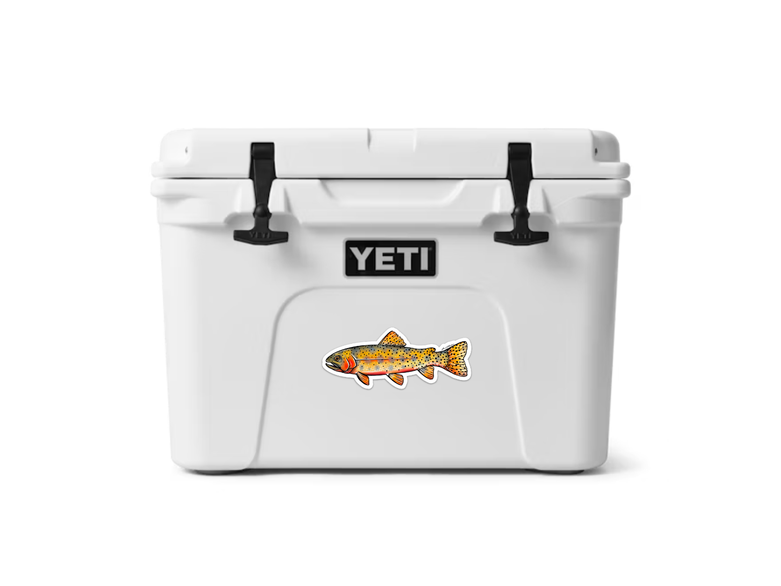 Durable outdoor vinyl waterproof Cutthroat Trout decal. Hand drawn original artwork! Perfect for your vehicle, boat, trailer, tackle boxes, coolers, water bottles, coffee mug, etc... Dimensions: 6" x 2.48".