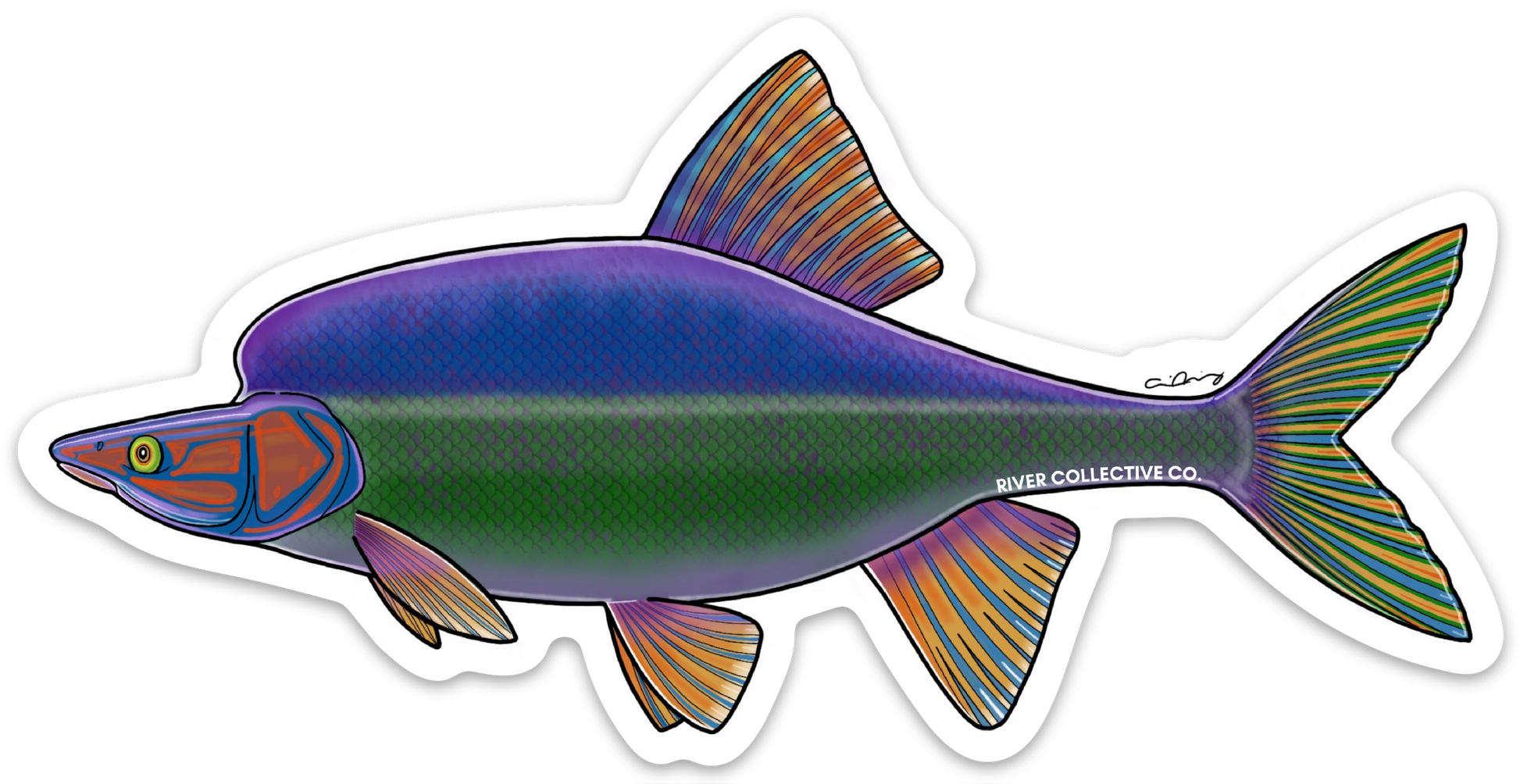 Durable outdoor vinyl waterproof Humpback Chub decal. Hand drawn original artwork! Perfect for your vehicle, boat, trailer, tackle boxes, coolers, water bottle, coffee mug, etc... Dimensions: 6" x 3.".