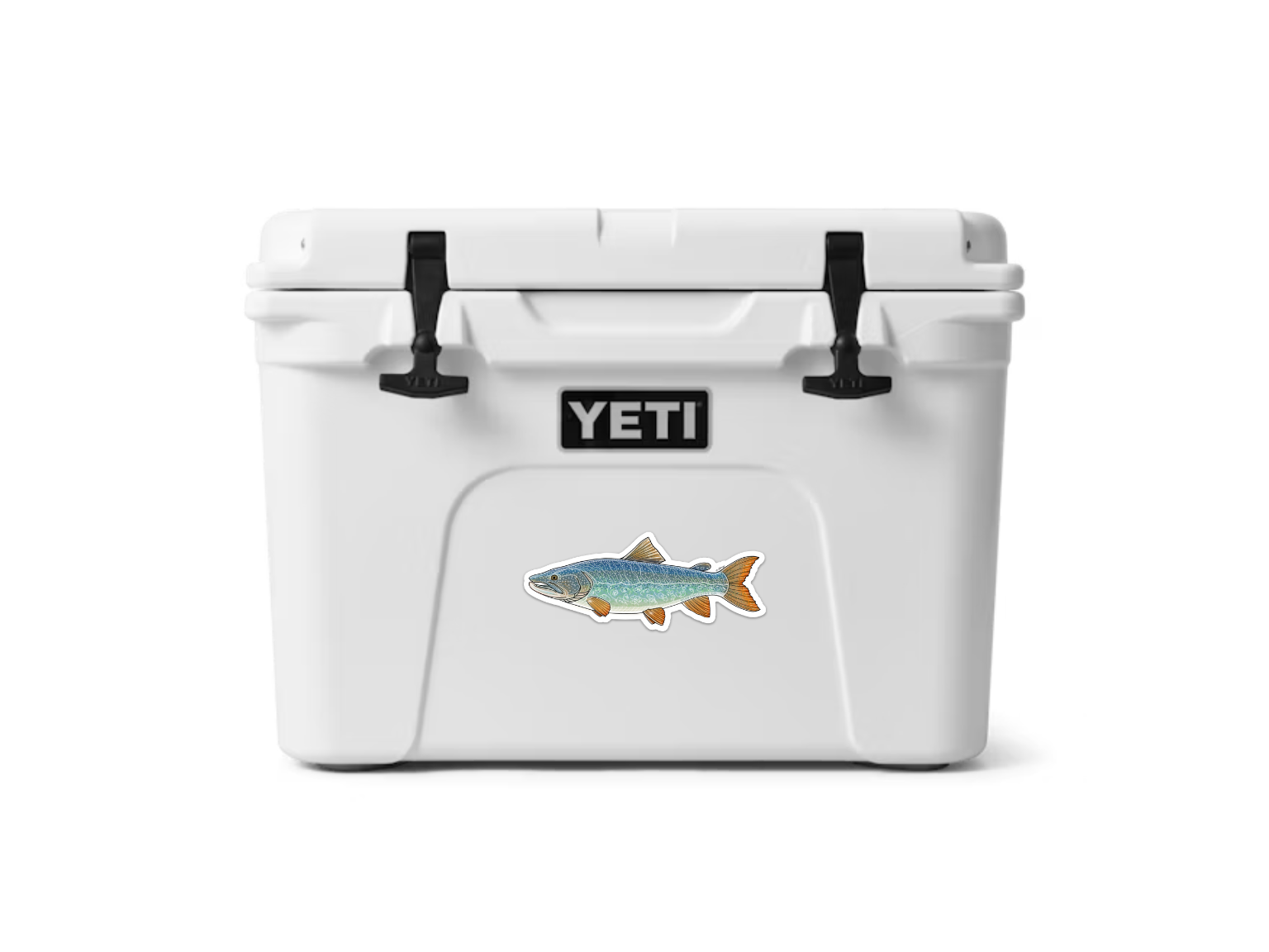 Durable outdoor vinyl waterproof Lake Trout decal. Hand drawn original artwork! Perfect for your vehicle, boat, trailer, tackle boxes, coolers, water bottles, coffee mug, etc... Dimensions: 6" x 2.5".