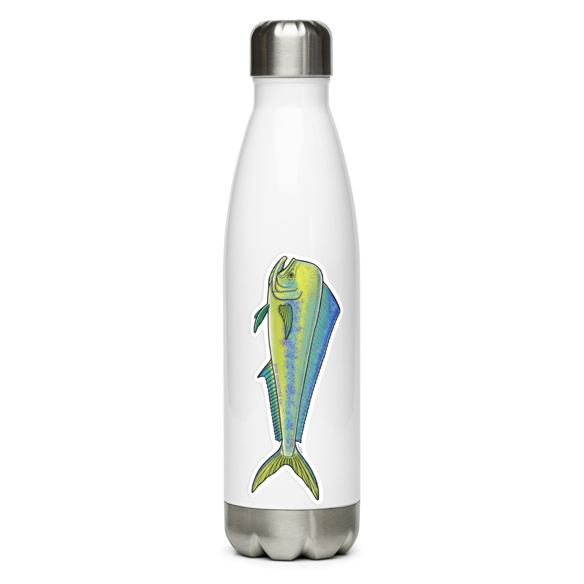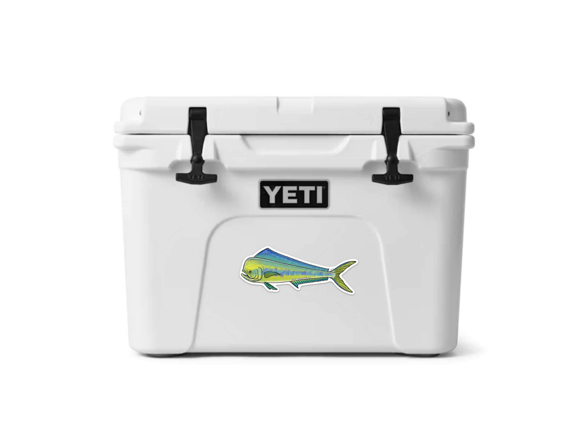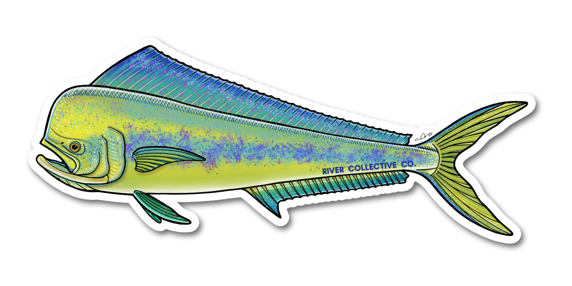 Durable outdoor vinyl waterproof Mah-Mahi decal. Hand drawn original artwork! Perfect for your vehicle, boat, trailer, tackle boxes, coolers, water bottles, coffee mug, etc... Dimensions: 6" x 2.5".