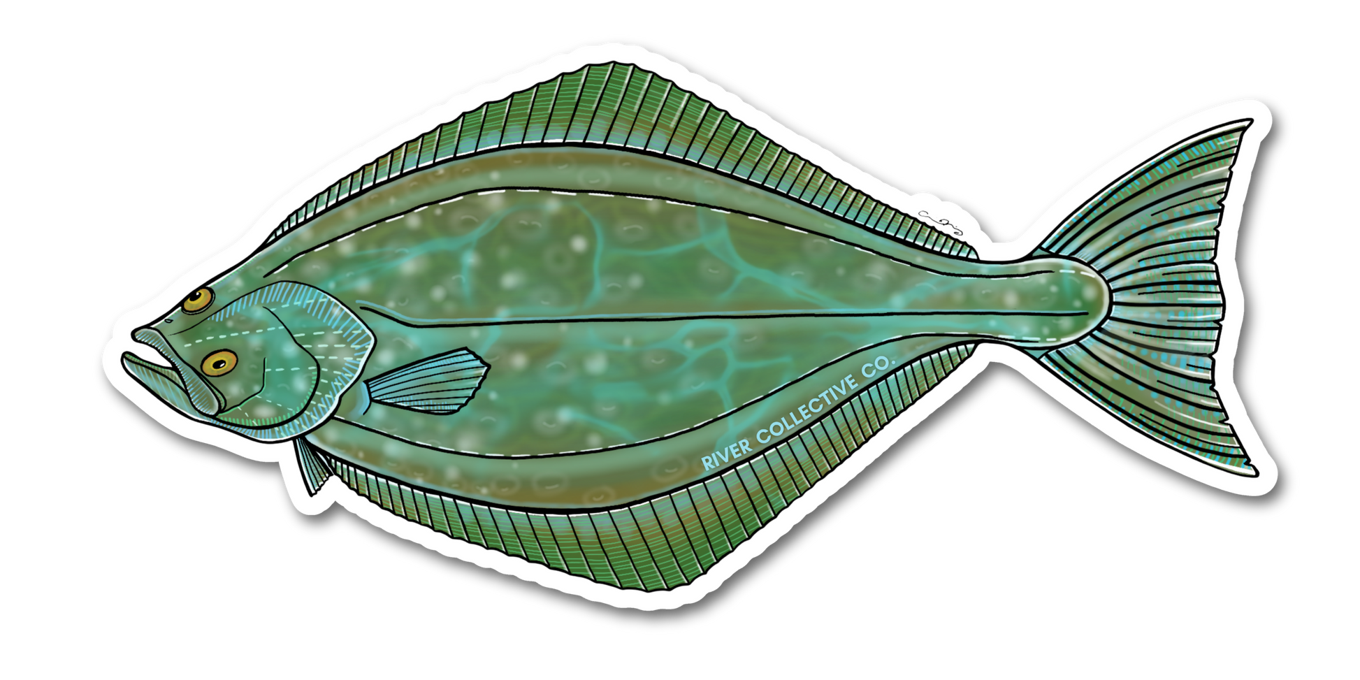 Durable outdoor vinyl waterproof Halibut Decal. Hand drawn original artwork! Perfect for your vehicle, boat, trailer, tackle boxes, coolers, water bottles, coffee mug, etc... Dimensions: 6" x 2.9".