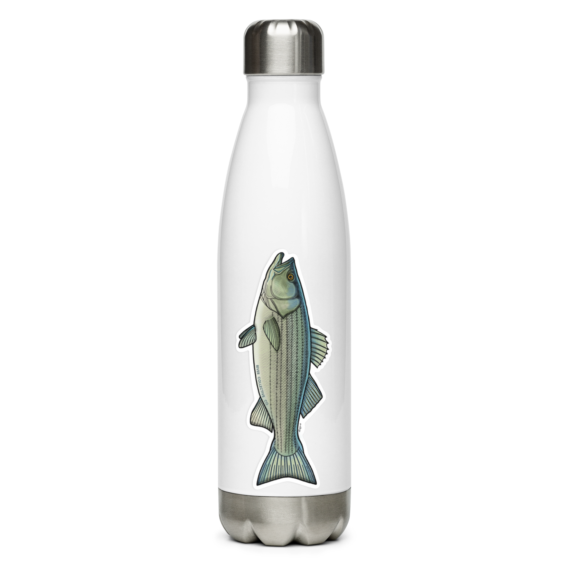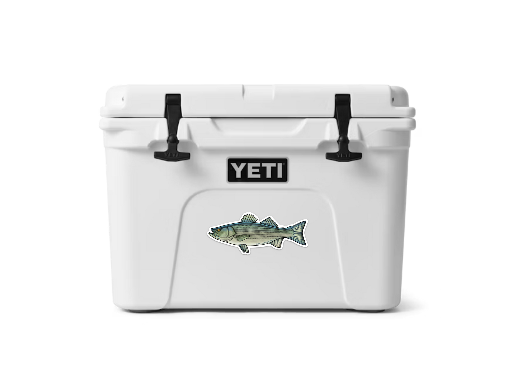 Durable outdoor vinyl waterproof Striped Bass. Hand drawn original artwork! Perfect for your vehicle, boat, trailer, tackle boxes, coolers, water bottles, coffee mug, etc... Dimensions: 6" x 2.5".